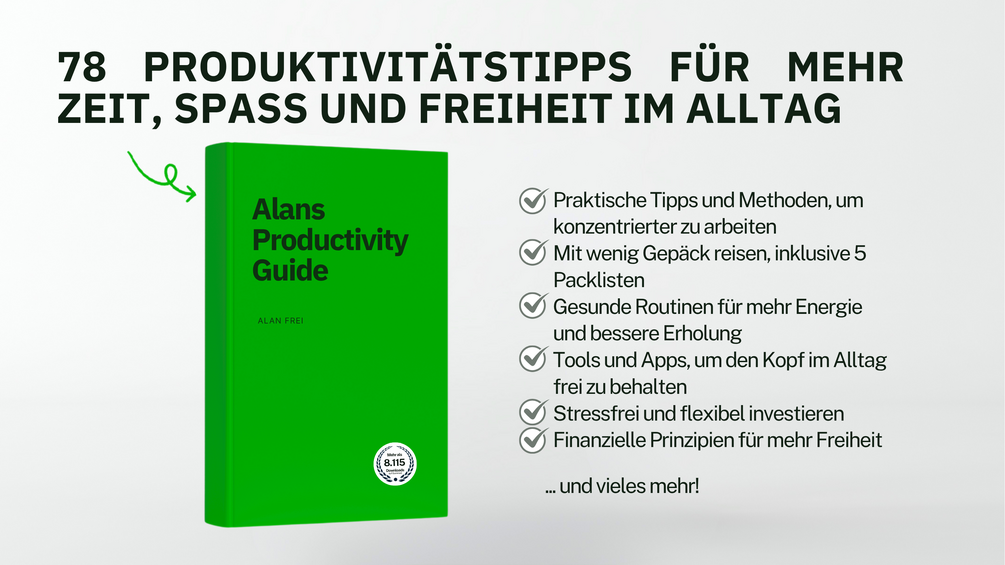 📗 Alans Productivity Guide ist eine Sammlung von über 78 praktischen Tools, Tricks und Strategien, die mir täglich helfen, konzentrierter zu arbeiten, produktiver zu sein und mehr Zeit für die Dinge zu gewinnen, die mir wichtig sind.
